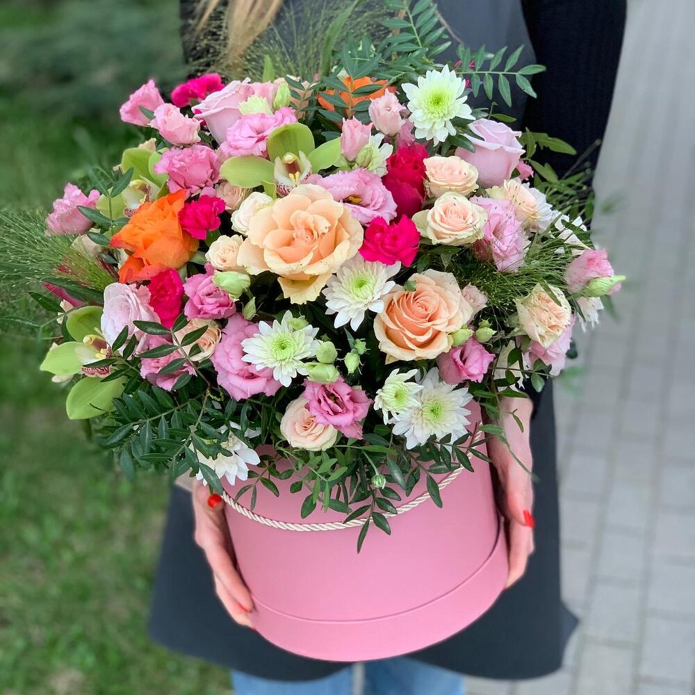Хризантема кустовая – 3 шт. Роза Эквадор – 7 шт. Эустома – 7 шт. Орхидея Цимбидиум – 3 шт. Писташ – 10 шт.