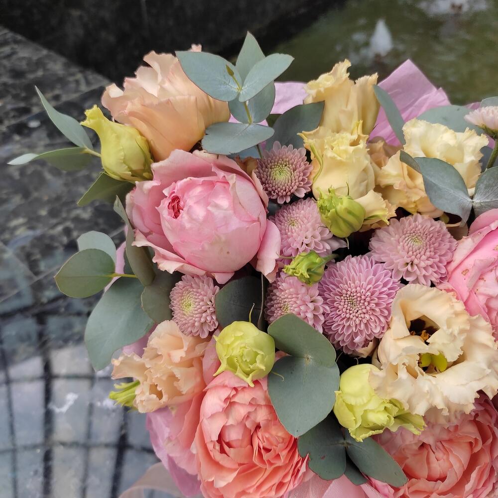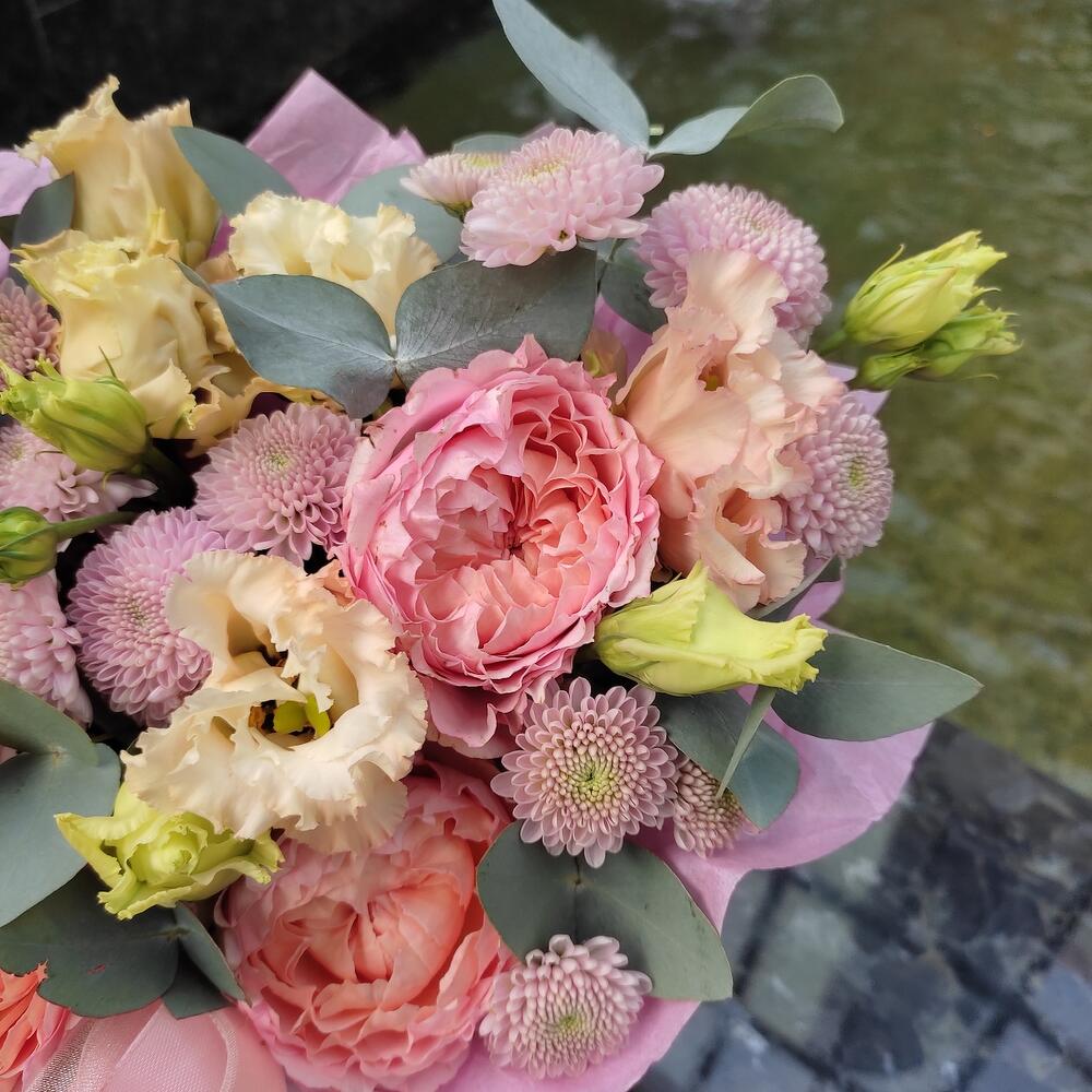 Категорий: Кустовые розы, Лизиантусы, Пионовидные розы, Розы, Хризантемы
