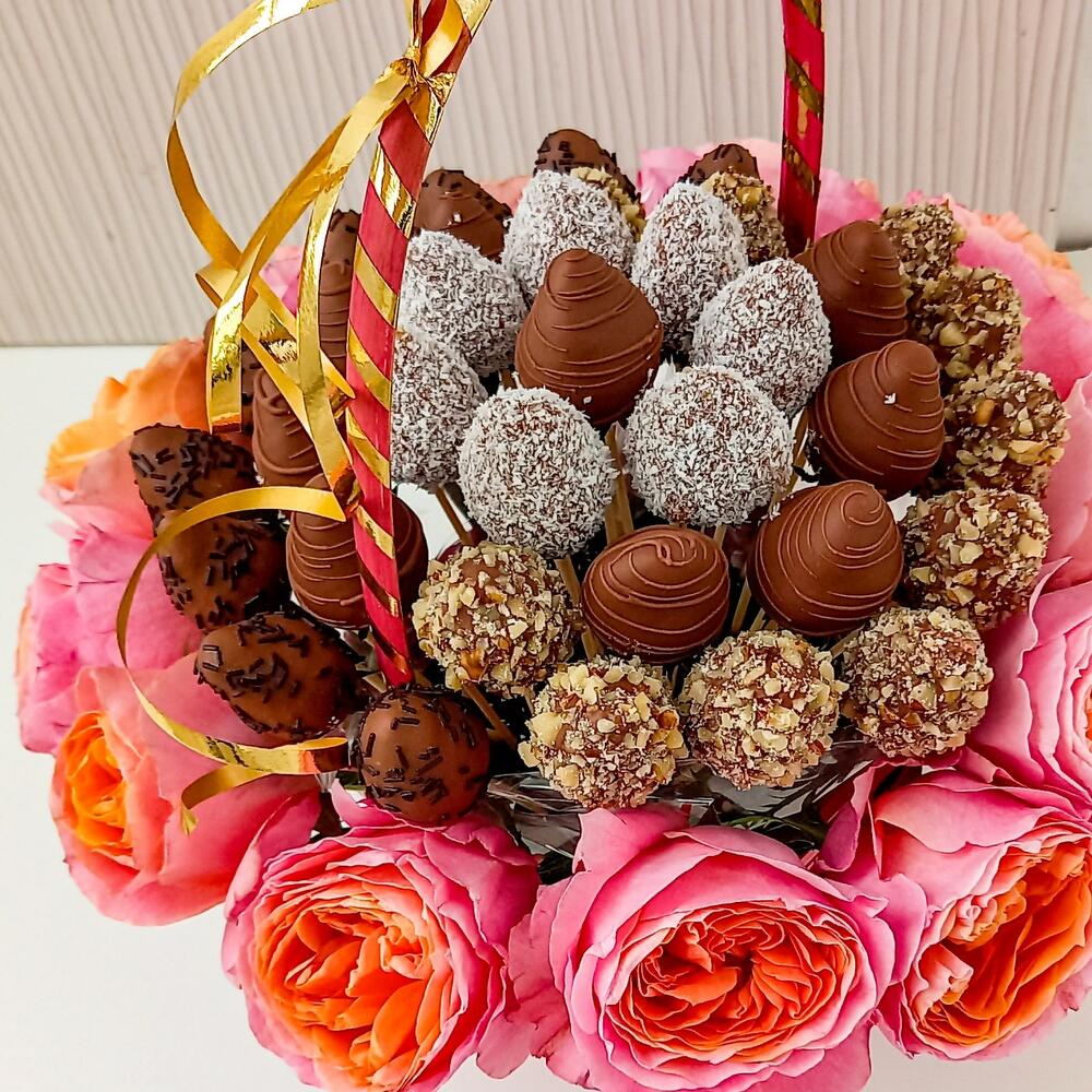 Клубника в шоколаде callebaut (бельгия) – 25 шт.Роза одноголовая – 13 шт.Корзина – 1 шт.