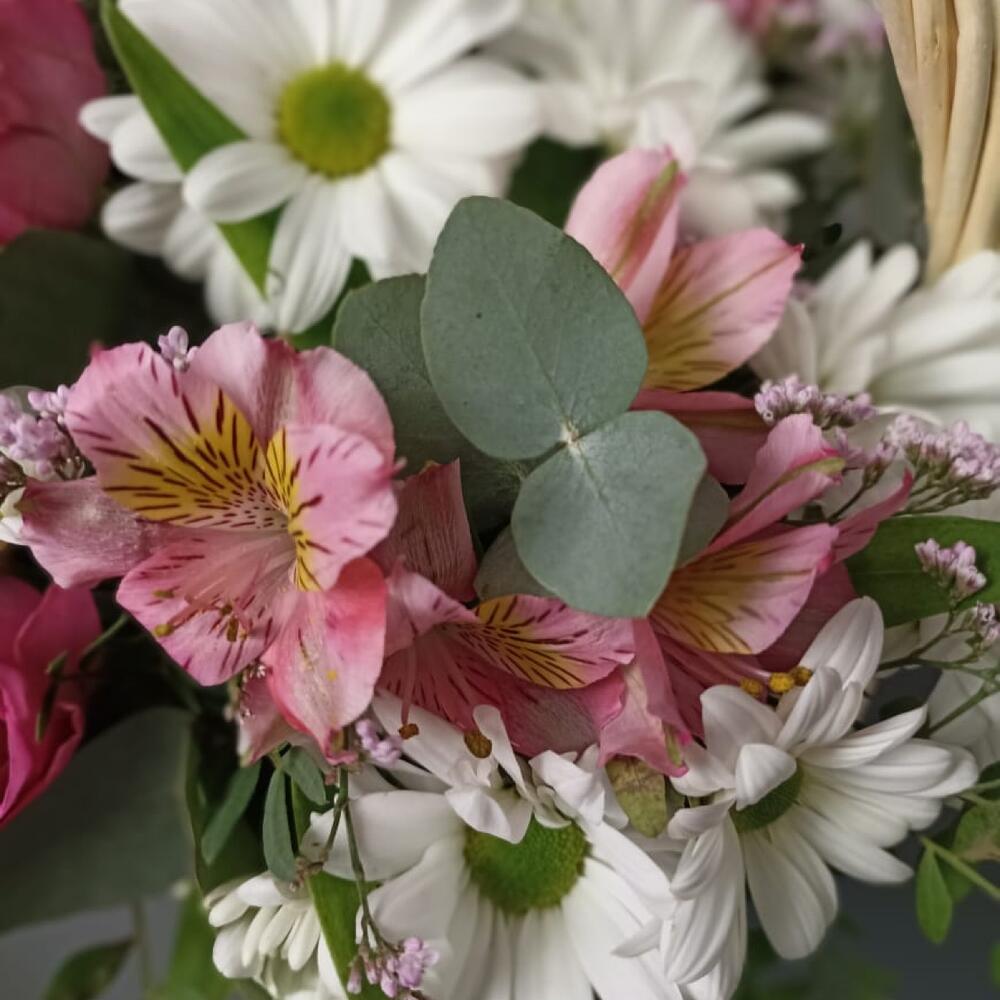 пионовидная кустовая роза misty bubbles – 3 шт.Альстромерия – 3 шт.Хризантема кустовая – 3 шт.Эвкалипт – 5 шт.Фисташка – 10 шт.Лимониум – 2 шт.Корзина плетеная – 1 шт.Оазис флористический – 1 шт.Лента атласная – 2 шт.