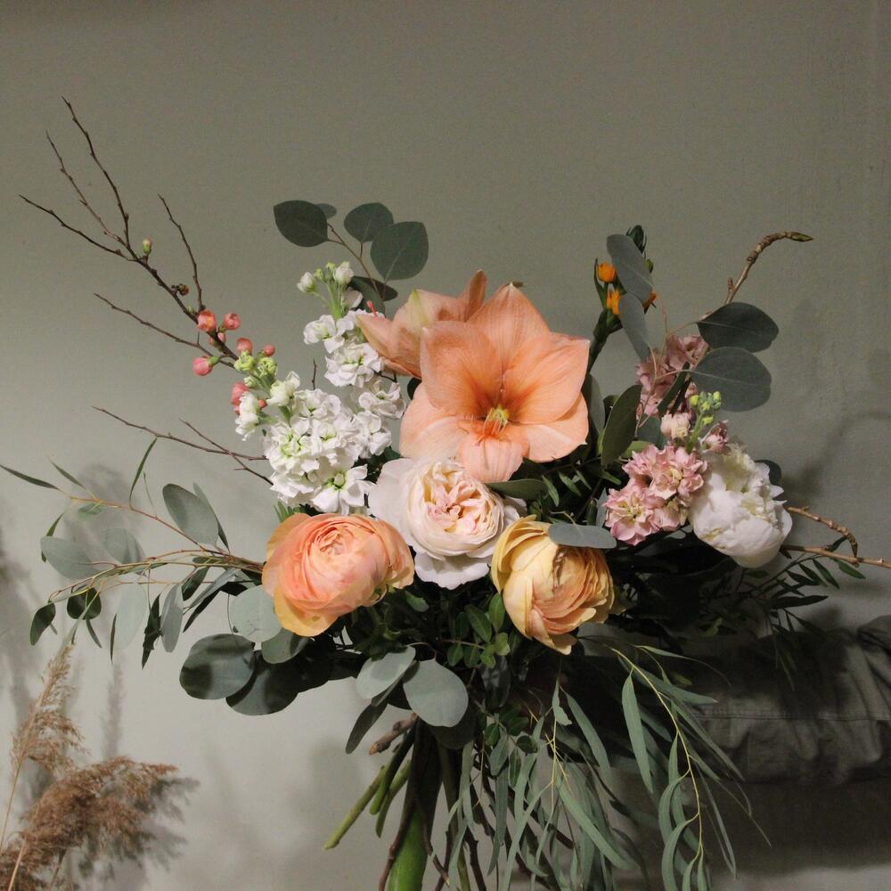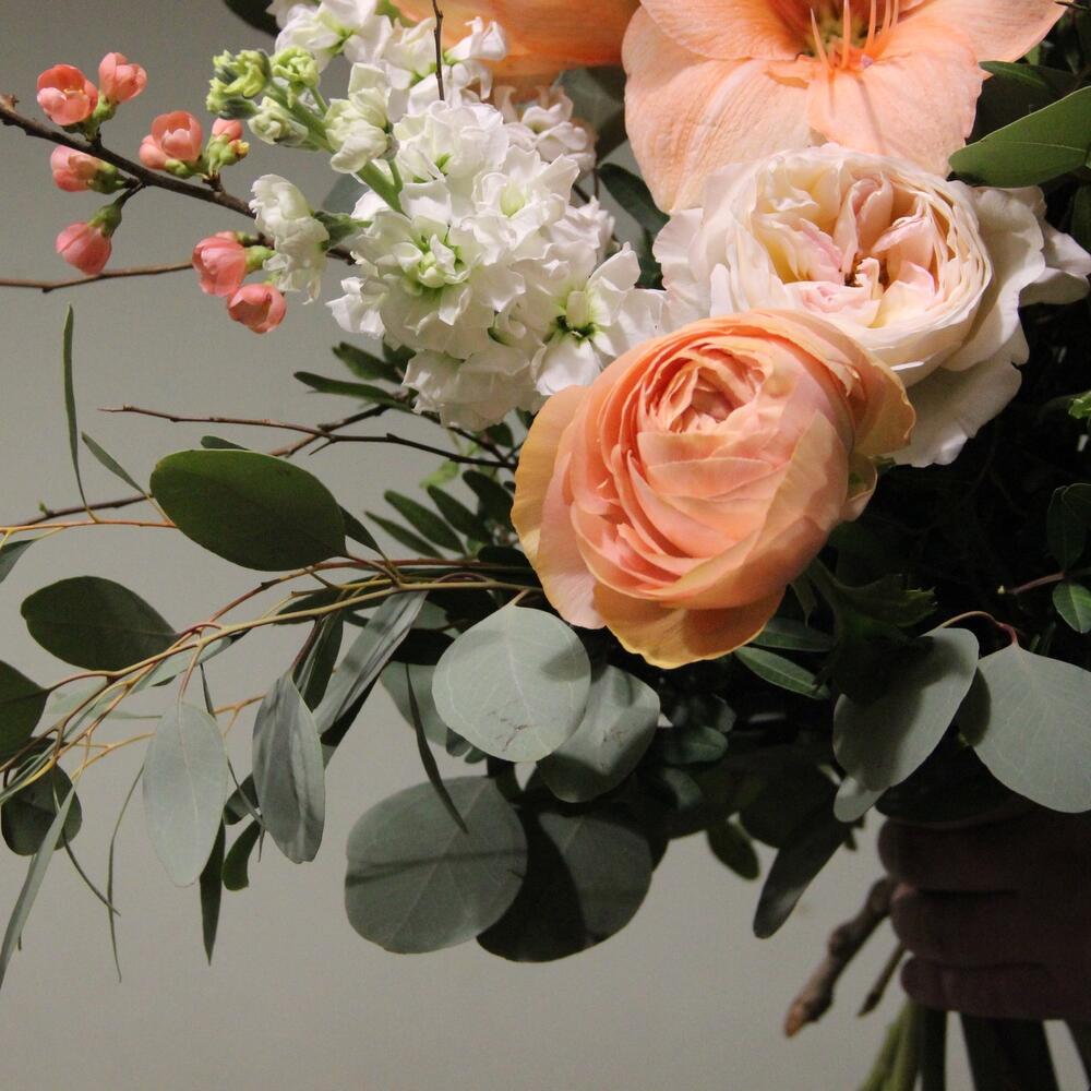 Пионовидные розы, цветущая айва, амариллис, орнитогалум, эвкалипт и маттиола.Стильное цветочное решение для любого случая.