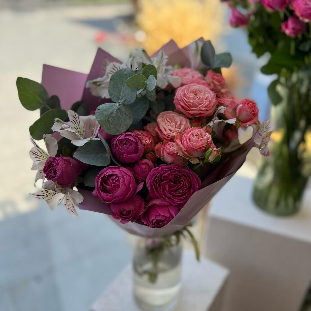 Спрей роза – 9 шт. Альстромерия – 5 шт. Упаковка дизайнерская – 1 шт. Открыточка с вашими пожеланиями – 1 шт.