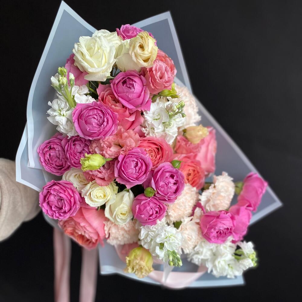 Маттиола – 9 шт.Кустовая роза – 5 шт.Гвоздика – 7 шт.зелень фисташки – 6 шт.пионовидные розы – 15 шт.