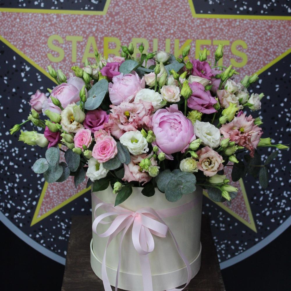 Эустома – 11 шт.Роза кустовая – 5 шт.Эвкалипт – 4 шт.Коробка шляпная – 1 шт.Оазис флористический – 2 шт.Лента атласная – 2 шт.Пион Сара Бернар – 5 шт.