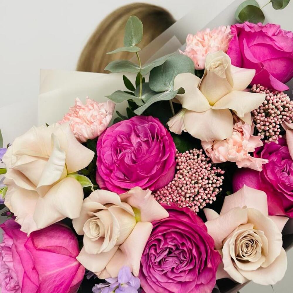 Роза Эквадор – 5 шт.Роза – 6 шт.Озотамнус – 2 шт.Диантус – 3 шт.Маттиола – 3 шт.Эвкалипт – 3 шт.Упаковка дизайнерская – 3 шт.