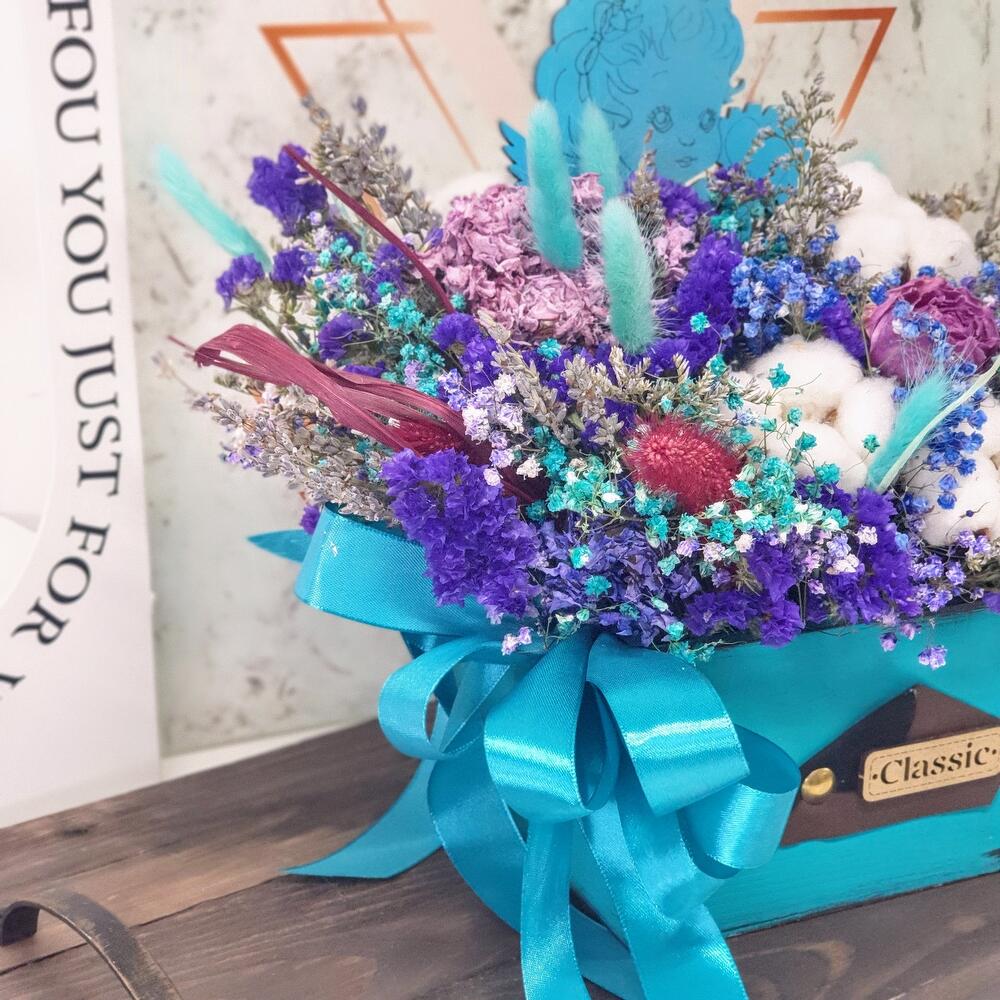 Ящик деревянный – 1 шт.Лаванда (сухоцвет) пучок – 1 шт.Хлопок натуральный – 4 шт.лимониум сухоцвет – 2 шт.лагурус (сухоцвет) пучок – 1 шт.гипсофила сухоцвет ветка – 4 шт.статица синяя сухоцвет – 4 шт.топпер деревянный ангел – 1 шт.