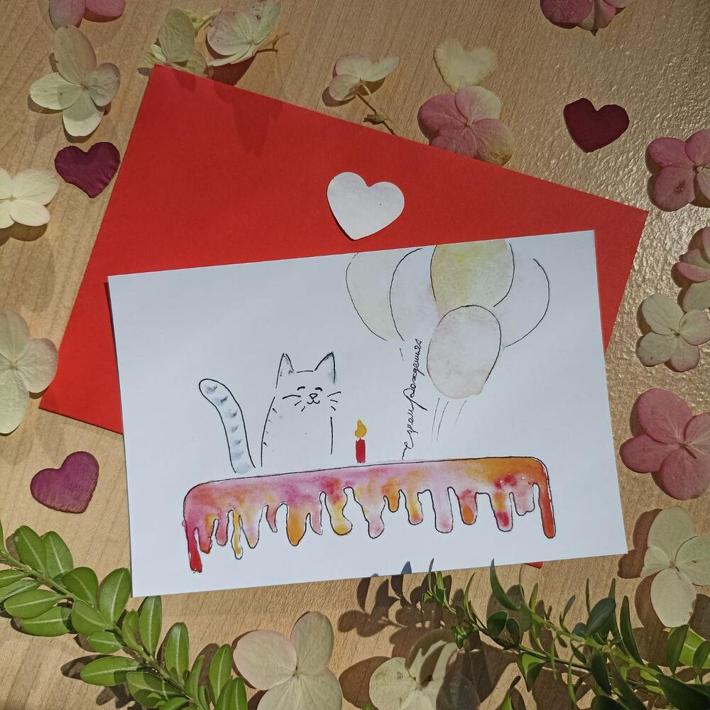 Открытка с любовью нарисована художником акварелью и отпечатана на плотной бумаге. Таких открыток нет нигде, кроме нашего магазина К каждой открытке Вы можете прислать текст в чат, который мы напечатаем в нескольких вариантах. Вы сможете выбрать тот шрифт, который Вам больше по душе, а мы аккуратно приклеим его к открытке.Открытку доставляем в ярком красном конверте, заклеенном сердечком, а внутрь кладём сухоцветы – сердечки из лепестков, лепестки, цветы и пару наклеек-сердечек❤Ждём Ваш текст для открытки в чате