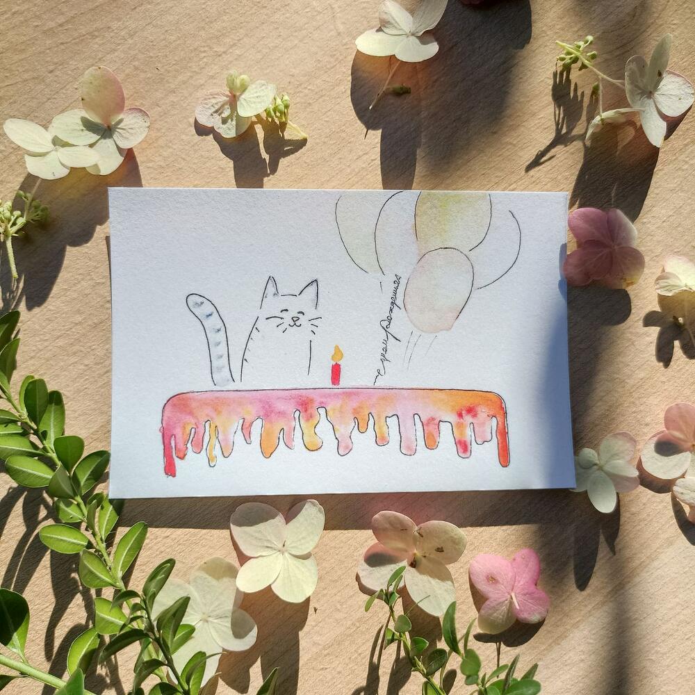 Открытка Кот с тортом “С днём рождения!” 10*15