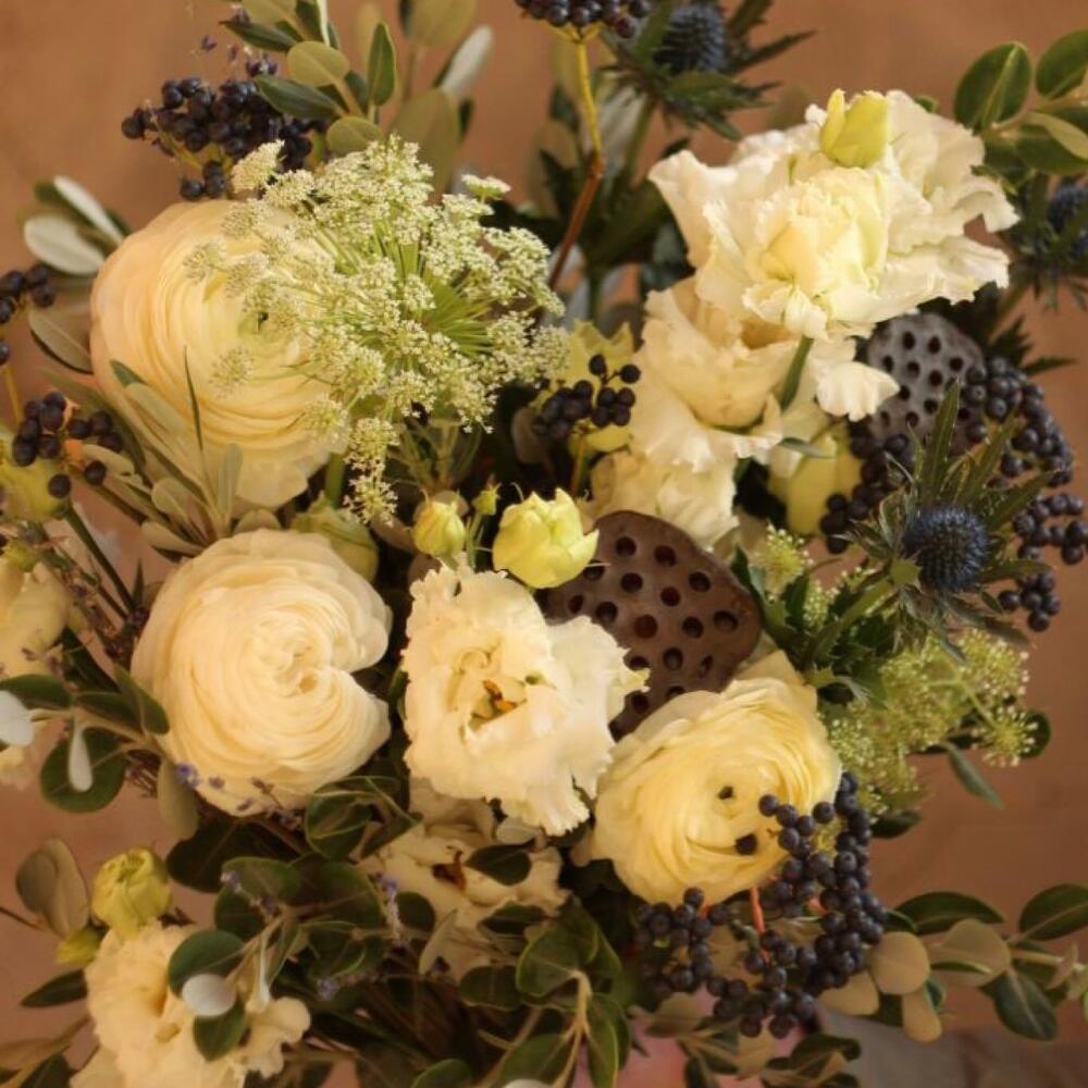 Ранункулюс – 3 шт.Лизиантус – 3 шт.Эрингиум – 2 шт.Лотос (коробочка) – 2 шт.Вибурнум ягодный – 4 шт.Амми – 2 шт.Лаванда – 15 шт.Питтоспорум – 3 шт.Лента – 1 шт.