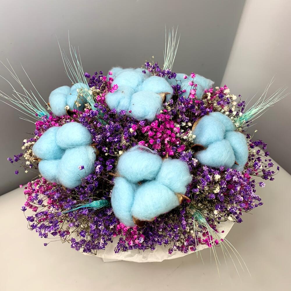 Хлопок – 7 шт.Лента атласная – 2 шт.Тишью – 2 шт.Коробка – 1 шт.Пленка прозрачная – 1 шт.Оазис флористический – 1 шт.Тритикум(пшеница) – 6 шт.гипсофила сухоцвет – 10 шт.