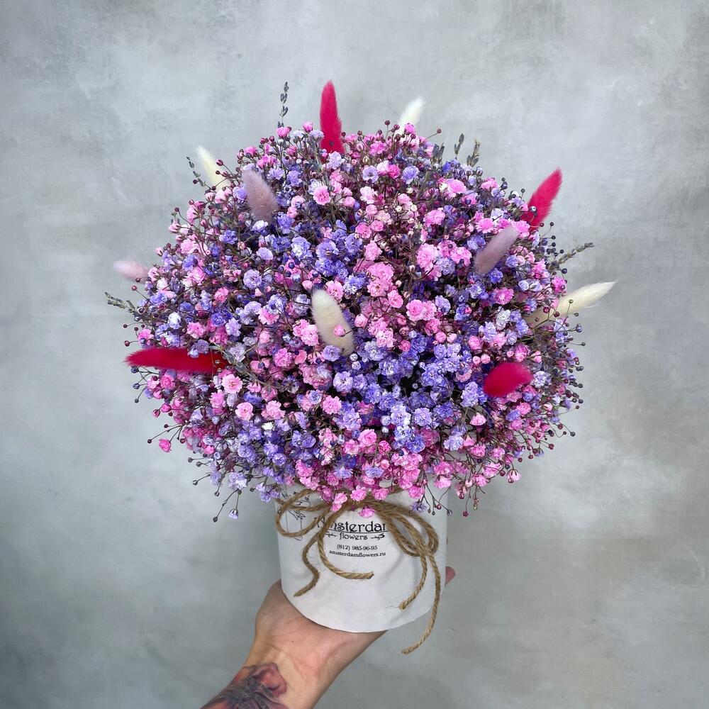 “Сиреневый туман” – композиция из гипсофилы в шляпной коробке
